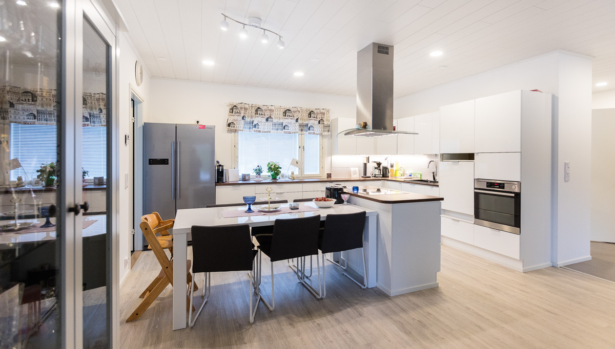 126 m², 5 huonetta ja keittiö. Peruspohja ratkaisuun tehty muutoksia laajentamalla takapihan terassia ja lisäämällä keittiöön saareke.
